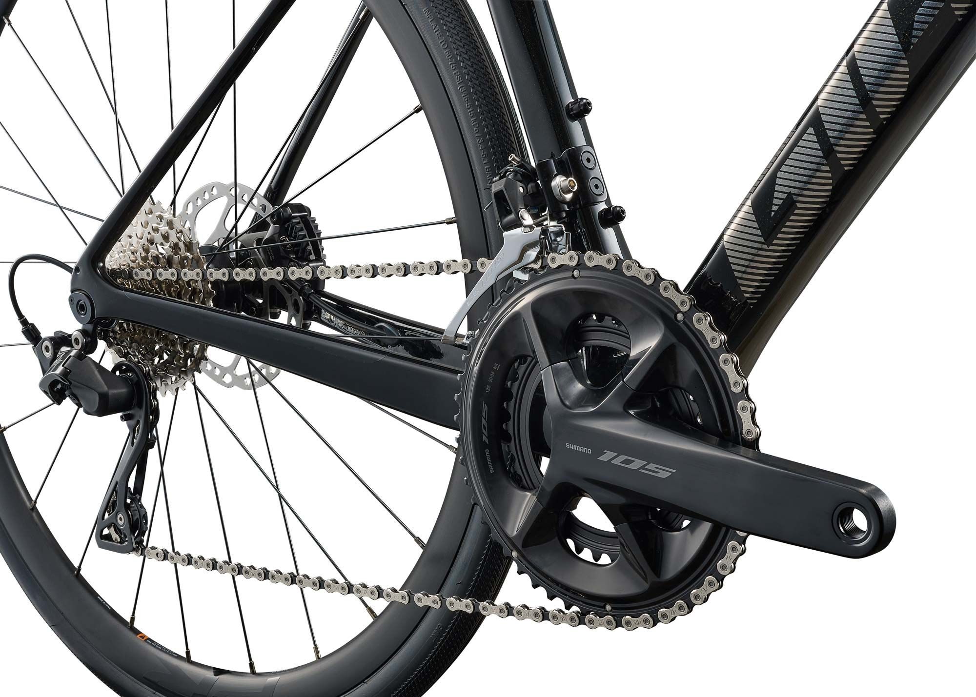 Велосипед оснащений перевіреною 12-швидкісною механічною трансмісією Shimano 105 з касетою 11-36T та системою 34/50T. Широкий діапазон передач дозволяє впевнено долати підйоми та розвивати високу швидкість на рівнині.