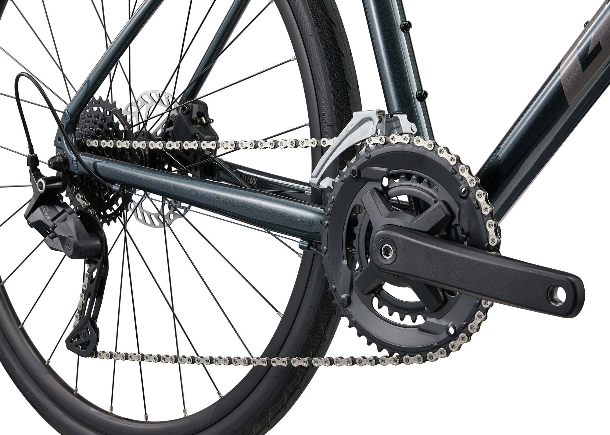 Велосипед оснащений 18-швидкісною трансмісією Shimano Cues з касетою 11-36T та системою 46/30T. Широкий діапазон передач дозволяє впевнено долати міські підйоми та розвивати високу швидкість на рівнині або під час фітнес-поїздок.