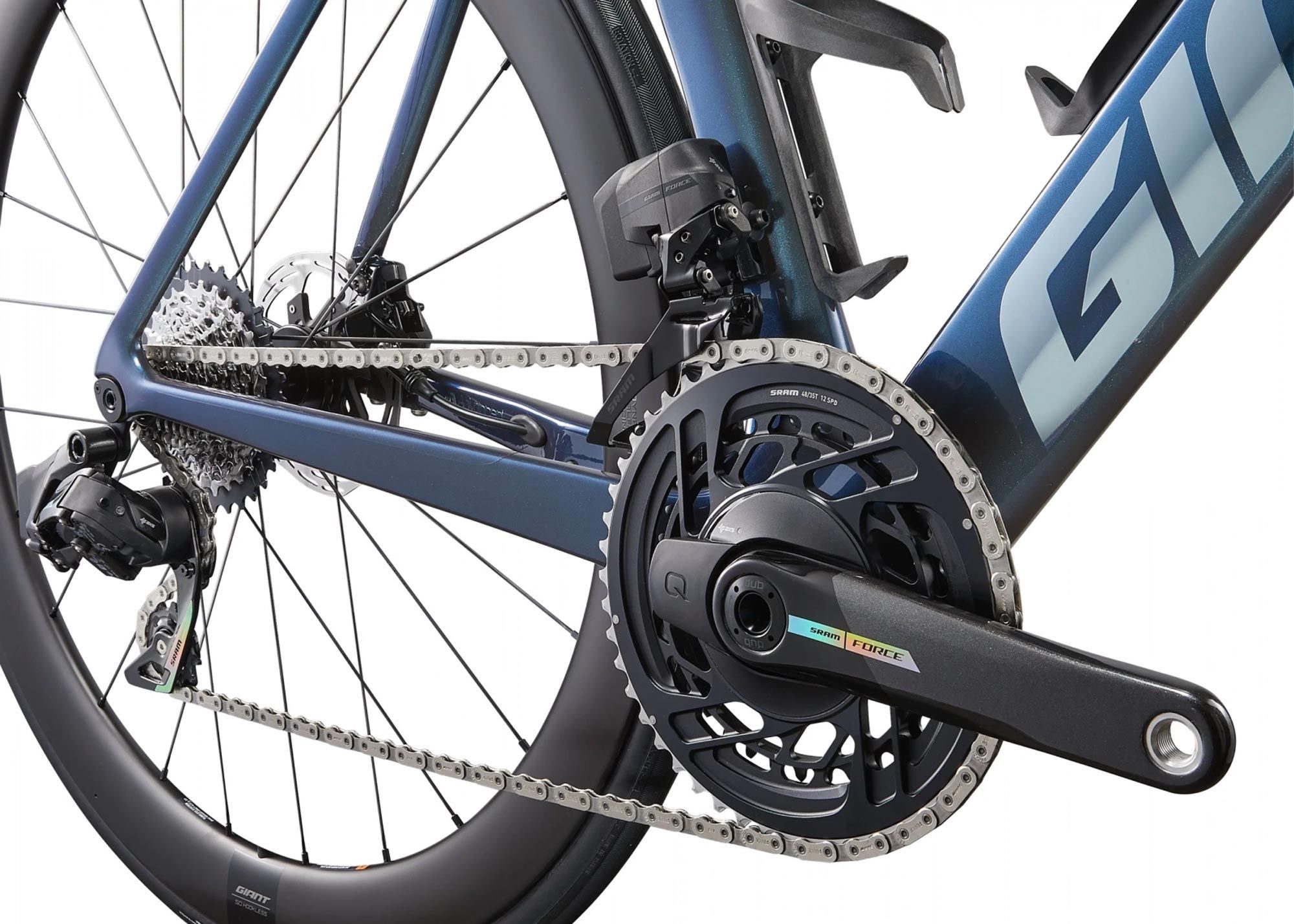 Електронна трансмісія SRAM Force eTap AXS 2×12 — бездротове, швидке і точне перемикання. Гідравлічні дискові гальма SRAM Force з роторами PaceLine (F 160 мм / R 140 мм) гарантують потужне і контрольоване гальмування.