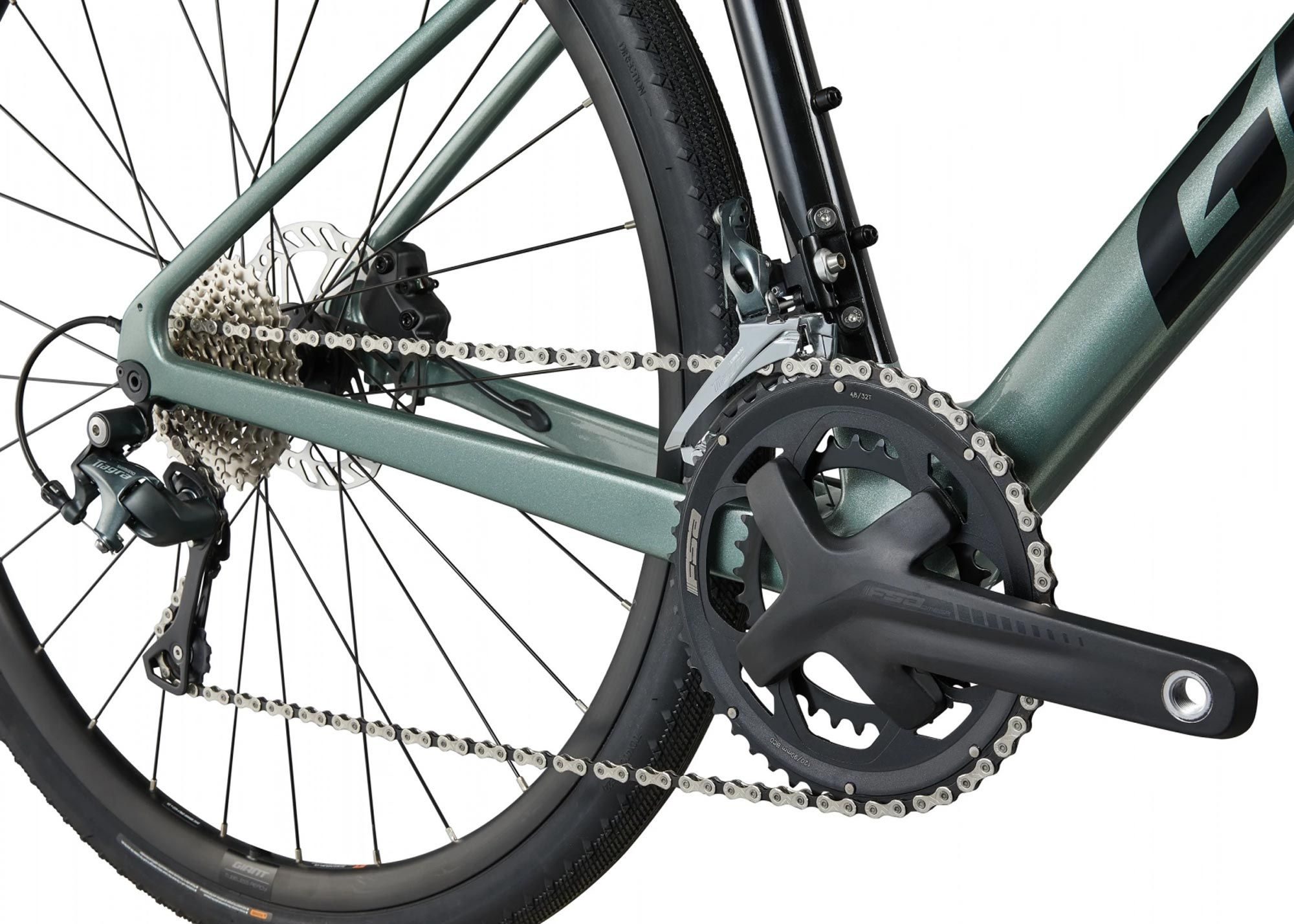 Shimano Tiagra 2×10 (шатун FSA Omega 32/48 T, касета Shimano CS‑HG500 11–34 T). Гідравлічні дискові гальма Tektro HD‑R210/HD‑R280 з роторами 160 мм забезпечують надійне гальмування.