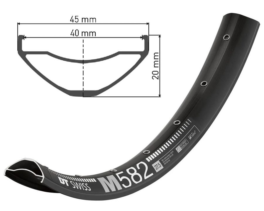 DT SWISS M 582 27.5x40 — високоякісний обід для трейлових та ендуро велосипедів, що витримує екстремальні навантаження. Зовнішній діаметр 27.5" (584 мм) і внутрішня ширина 40 мм забезпечують ідеальну підтримку для широких покришок, дозволяючи кататися на низькому тиску з максимальною стабільністю.