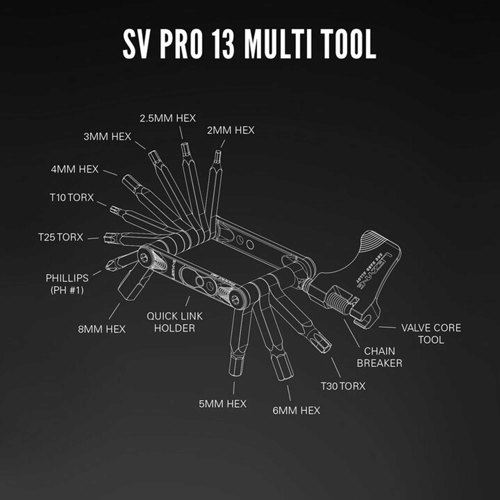 SV PRO 13 включає в себе найнеобхідніші інструменти, що дозволяють обслуговувати велосипед у польових умовах. Ви зможете підлаштувати посадку, замінити ланку ланцюга або підкрутити ротор — і все це за допомогою одного компактного інструмента.