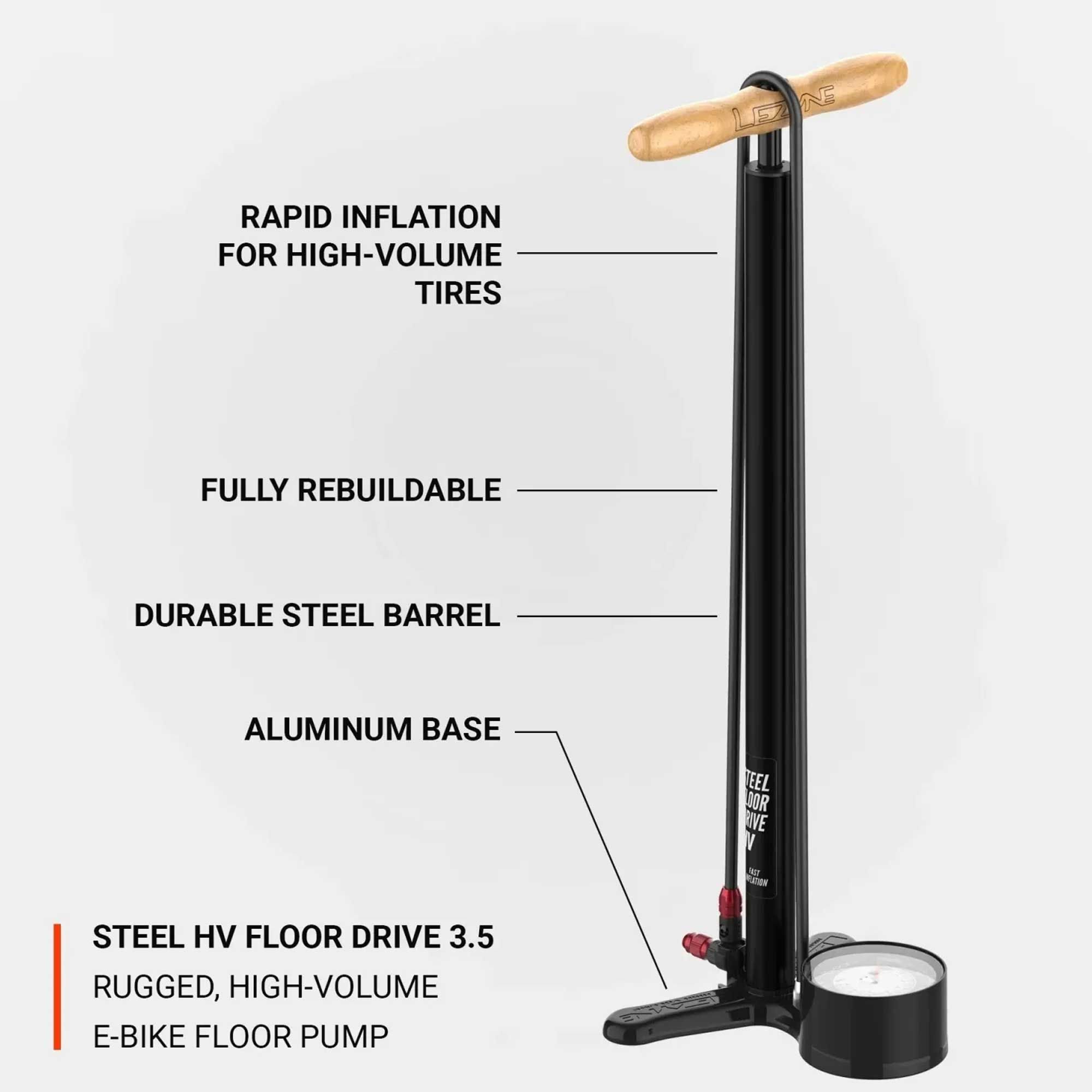 LEZYNE STEEL FLOOR DRIVE HV — це високоефективний підлоговий насос, розроблений спеціально для накачування шин великого об’єму (MTB, gravel, fatbike). Завдяки збільшеному внутрішньому діаметру корпусу, він дозволяє швидше подавати повітря при робочому тиску до 100 psi.