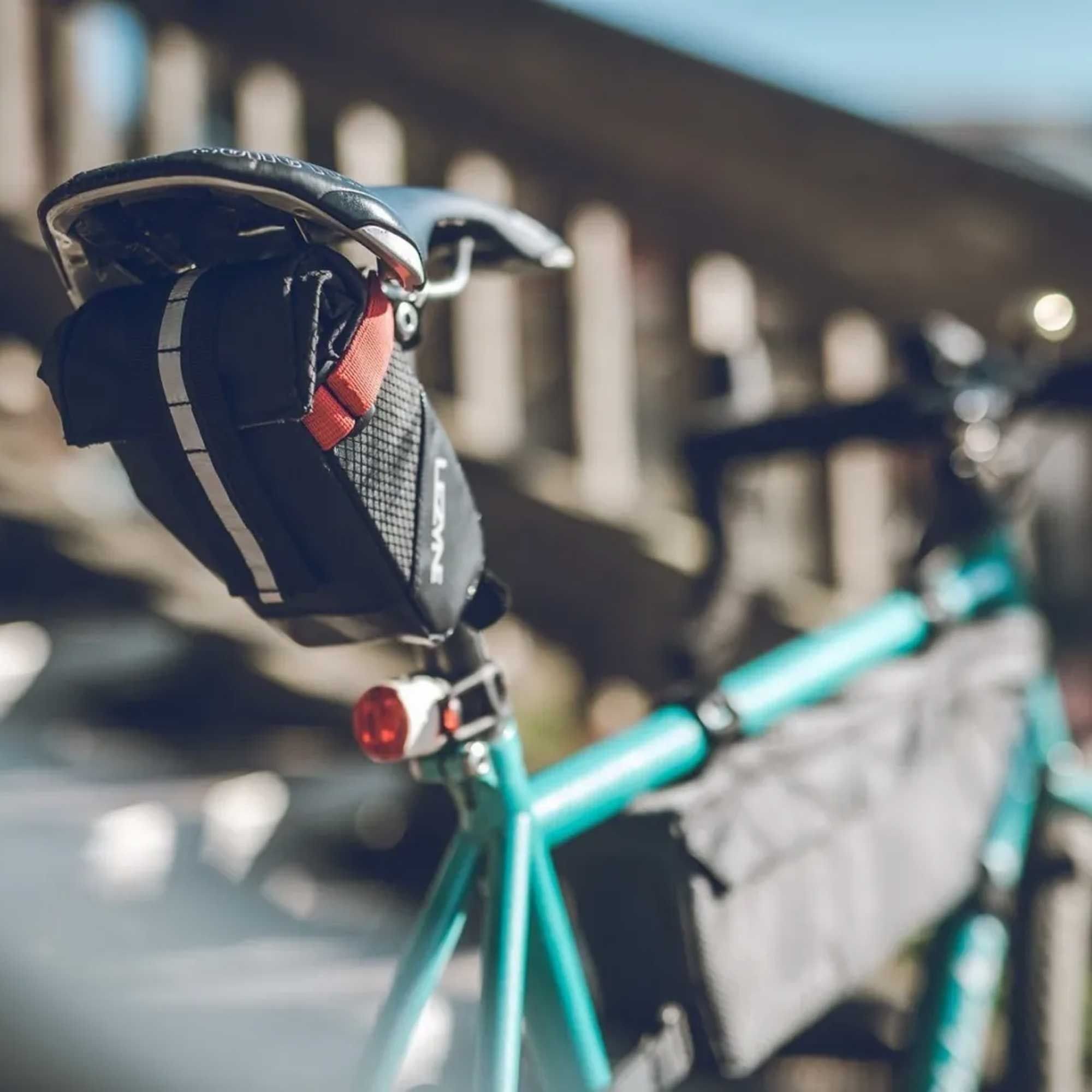 Сумка кріпиться під сідлом за допомогою надійних липучок, що забезпечує стабільність та запобігає її зміщенню під час їзди. Світловідбиваючі елементи підвищують вашу видимість на дорозі в умовах поганої освітленості, сприяючи безпечнішому пересуванню.