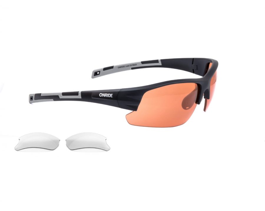 Окуляри з помаранчевими лінзами 2 категорії затемнення. У наборі є змінні лінзи: прозора 0 категорії замтемненняНосоупори з можливістю регулювання та заміниВ комплекті м'який чохол з мікрофібри для протирання лінзМодель з чорно-сірою оправою