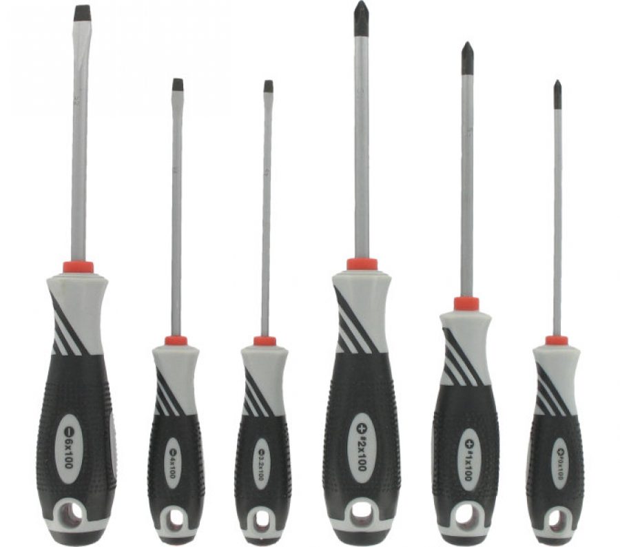 Профессиональный набор отверток VAR (6 шт), включает 3 плоских (3.2/4/6 мм) и 3 Phillips (№0, №1, №2). Лезвия высшего качества с намагниченными наконечниками. Эргономичная, противоскользящая ручка двойной плотности обеспечивает комфорт и максимальный крутящий момент.