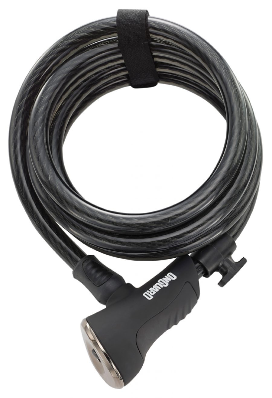 Замок Onguard DOBERMAN, спиральный трос 185см х 12мм, 5 ключей, поворотный держатель на раму, черный