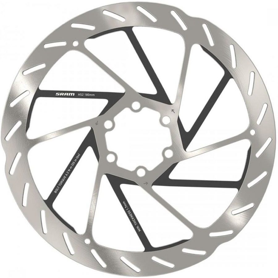 Новый тормозной SRAM HS2 180 мм - специально разработан для горных велосипедов для улучшения тормозной мощности, уменьшения уровня шума и повышения эффективности отвода тепла. Ротор имеет новый рисунок на тормозной поверхности, что обеспечивает лучшее сцепление с колодками, а также спицы с углублениями и теплопроводной краской для оптимального рассеивания тепла.
