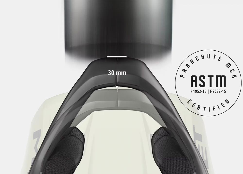Parachute MCR оснащен системой MIPS-C2®, которая обеспечивает дополнительную защиту от ротационных сил при ударе. Шлем сертифицирован не только по европейским и американским стандартам (CE EN 1078, CPSC), но и по ASTM F1952 — обязательный стандарт для full-face шлемов, подтверждающий пригодность для эндуро и даунхила.