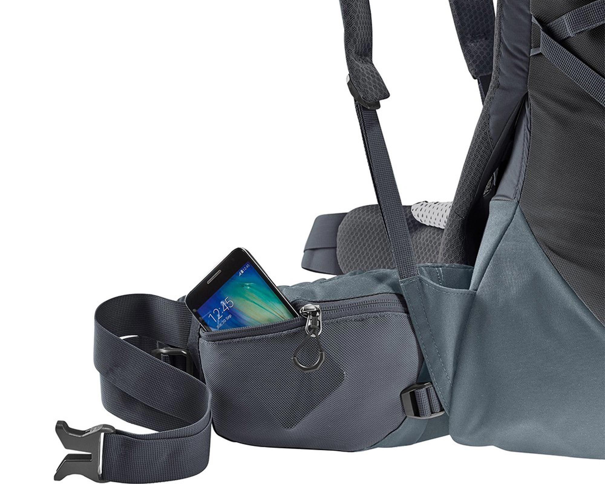 Основное отделение на 50&л, lid‑ворот и съемные боковые hip‑фины добавляют к 10 л — общая емкость примерно 60&л; рекомендуемая нагрузка 15‑20 кг.