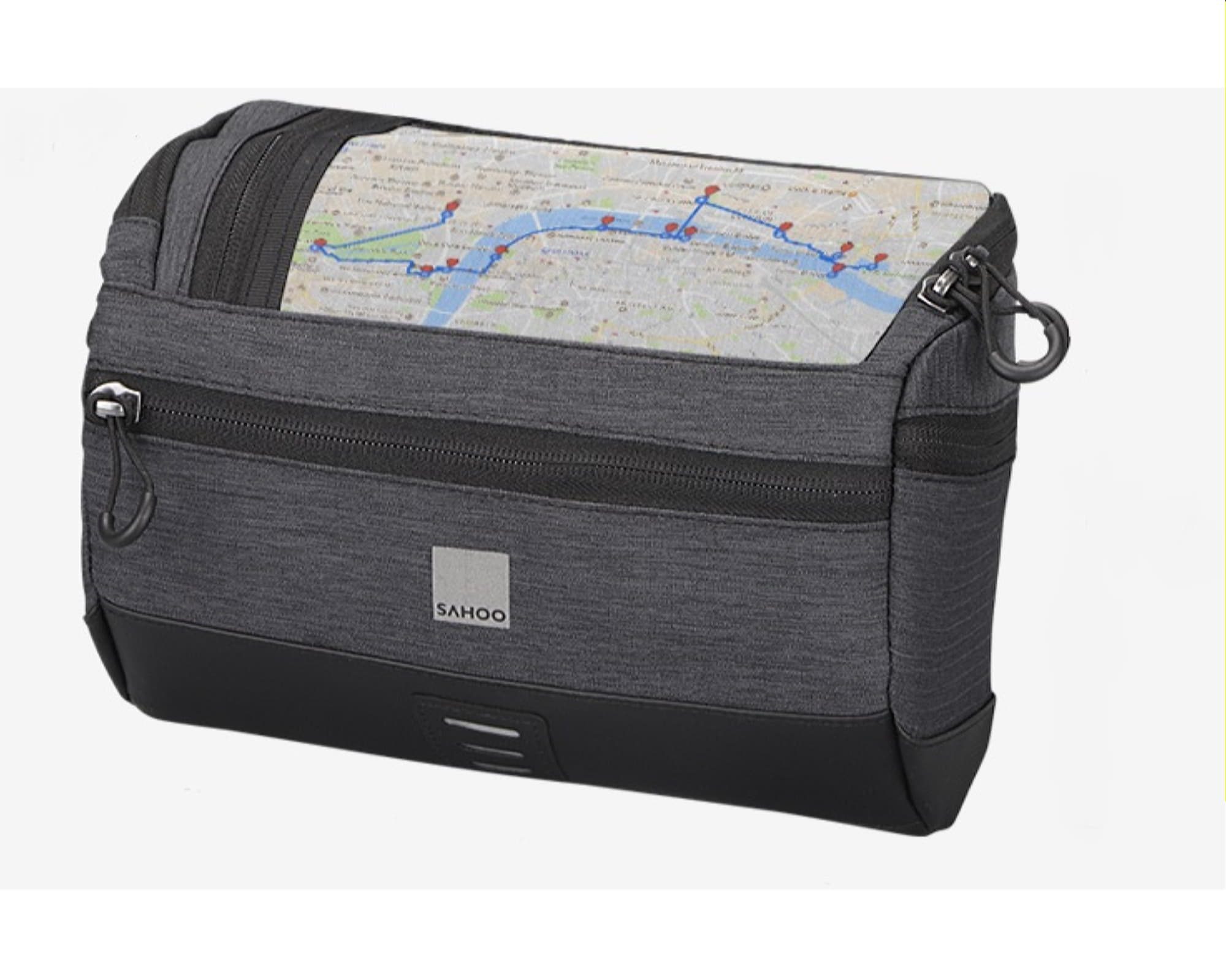 Зручна об'ємна сумка на кермо з прозорим відділом зверху для гаджета чи мапи та череплічним ременем для зручності носіння.