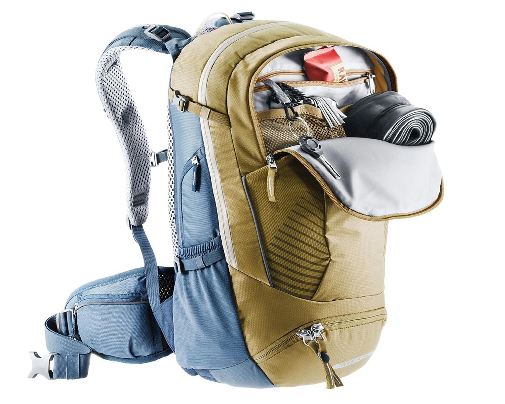 Система Deuter Airstripes гарантує оптимальну вентиляцію та стабільність рюкзака навіть на бездоріжжі, а анатомічні лямки з м’якими краями забезпечують комфорт під час тривалого використання. Поясний ремінь із кишенями, нагрудна стяжка та стабілізуючі ремені сприяють ідеальній посадці.