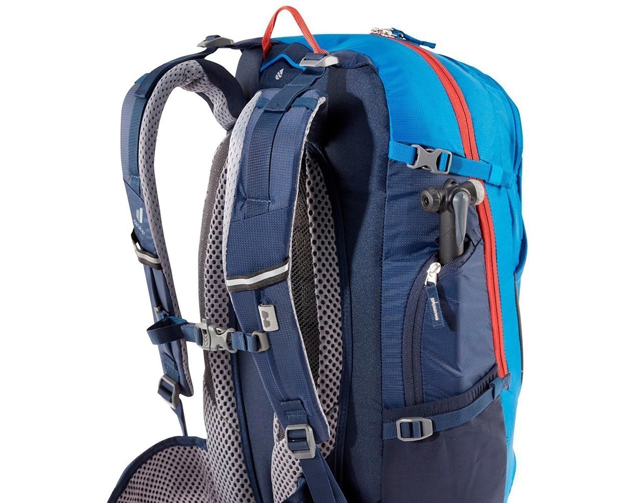 | Особливості | система спини Deuter Airstripes, ергономічні лямки, поясний ремінь із кишенями, регульована грудна стяжка, додатковий нижній доступ, внутрішня перегородка, фронтальна кишеня з органайзером, кишеня для смартфона чи карти, кріплення для шолома, відділення для насоса й інструментів, сумісність із питною системою, дощовий чохол, світловідбивачі |