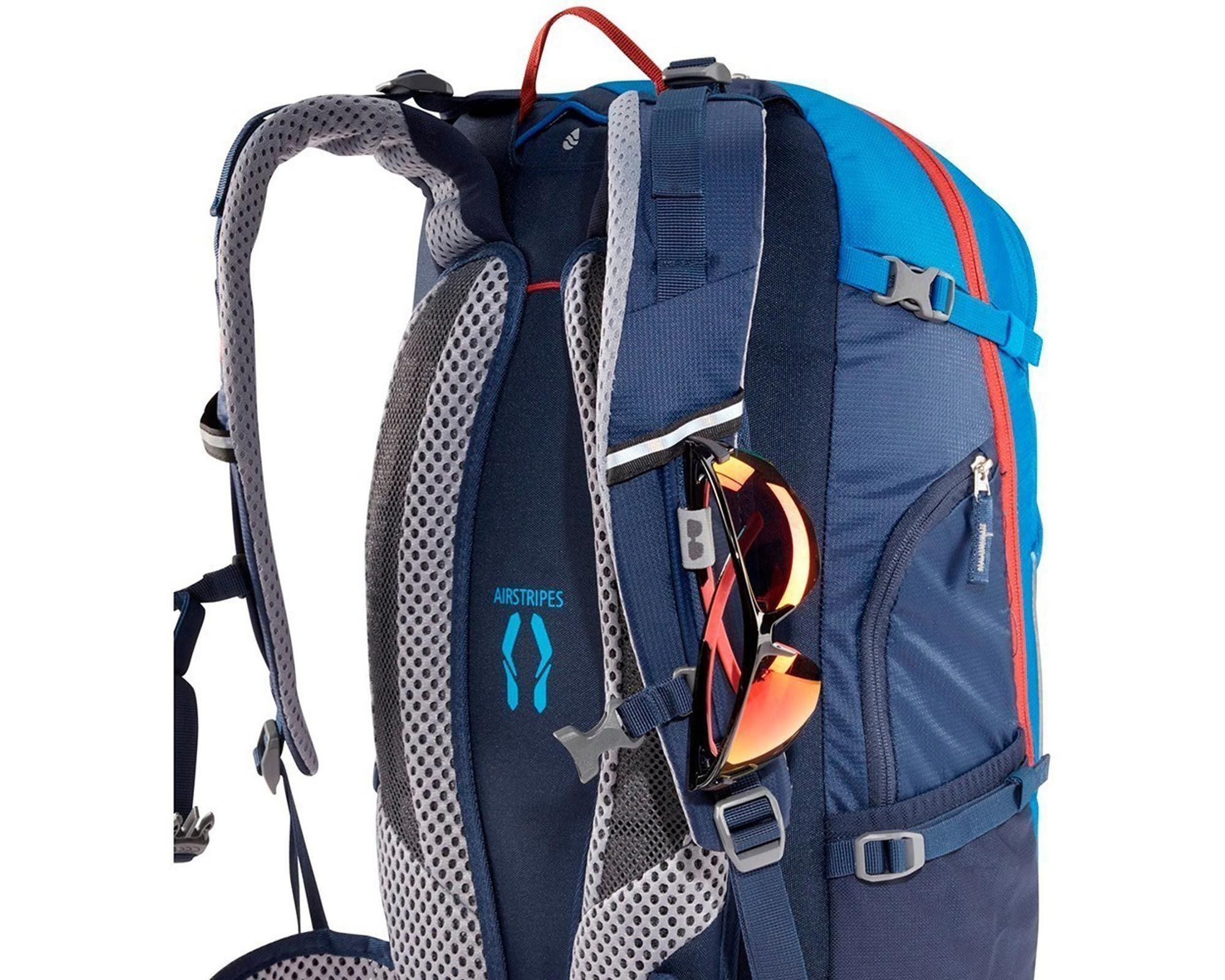 Система Deuter Airstripes складається з двох контурних пінистих подушок із вентиляційним каналом і сітчастим матеріалом Wide AirMesh, що гарантує відмінну вентиляцію та щільну посадку. Зменшена площа контакту зі спиною забезпечує кращий комфорт у дорозі.