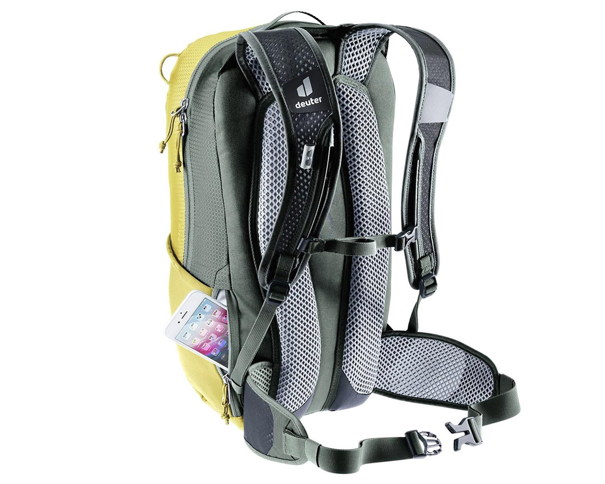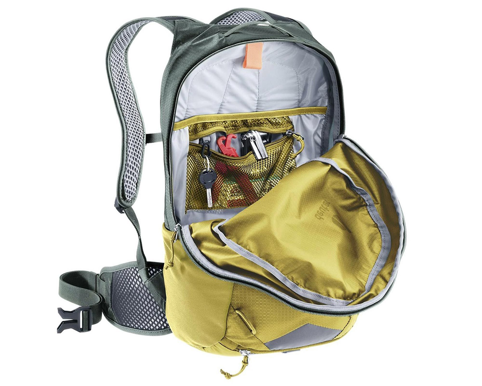 Deuter Race 16 turmeric-ivy — це велосипедний рюкзак, що поєднує легкість, функціональність і екологічність. Завдяки системі Airstripes рюкзак забезпечує відмінну вентиляцію спини та стабільну посадку навіть під час їзди пересіченою місцевістю.