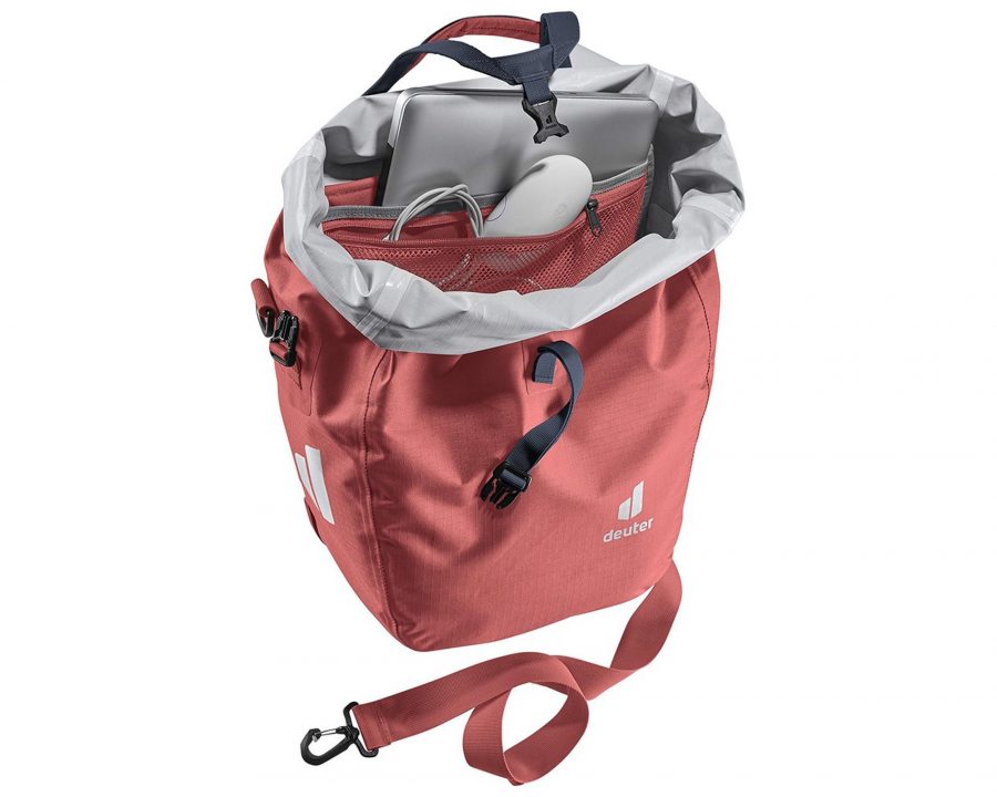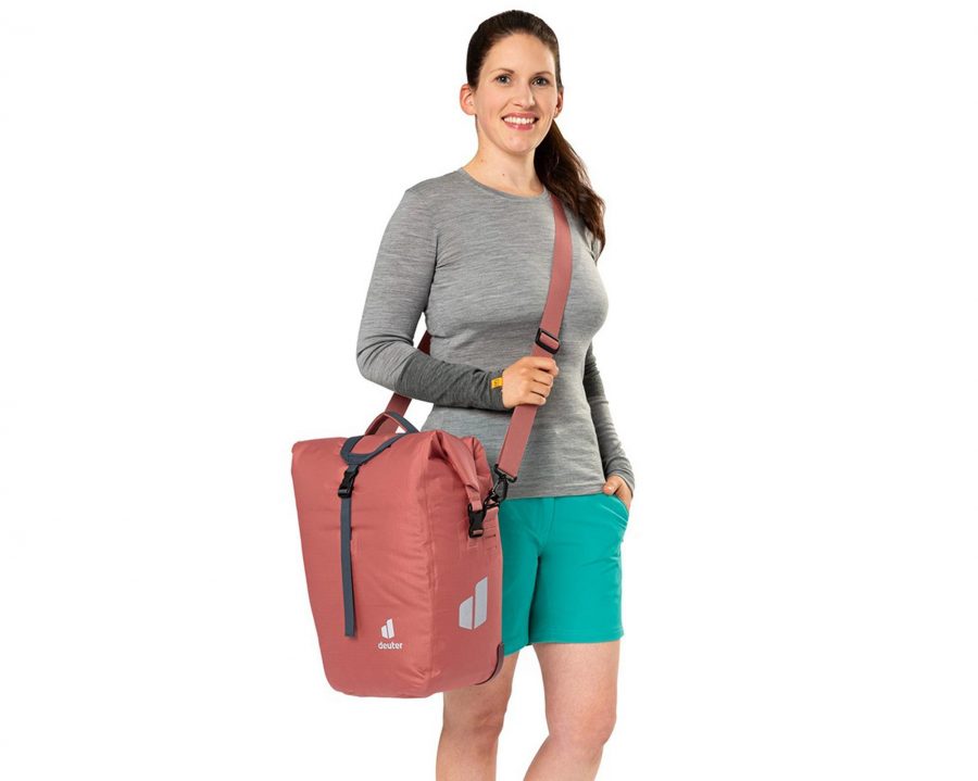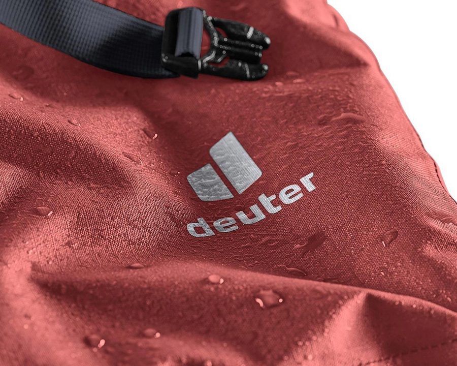 Deuter Weybridge 20+5 redwood — компактна і функціональна водонепроникна сумка для велосипеда, яка ефективно захищає багаж від дощу та дорожніх бризок. Модель виготовлена з високоякісного матеріалу 420D PA TOMCOAT, що забезпечує довговічність та стійкість до зношування.