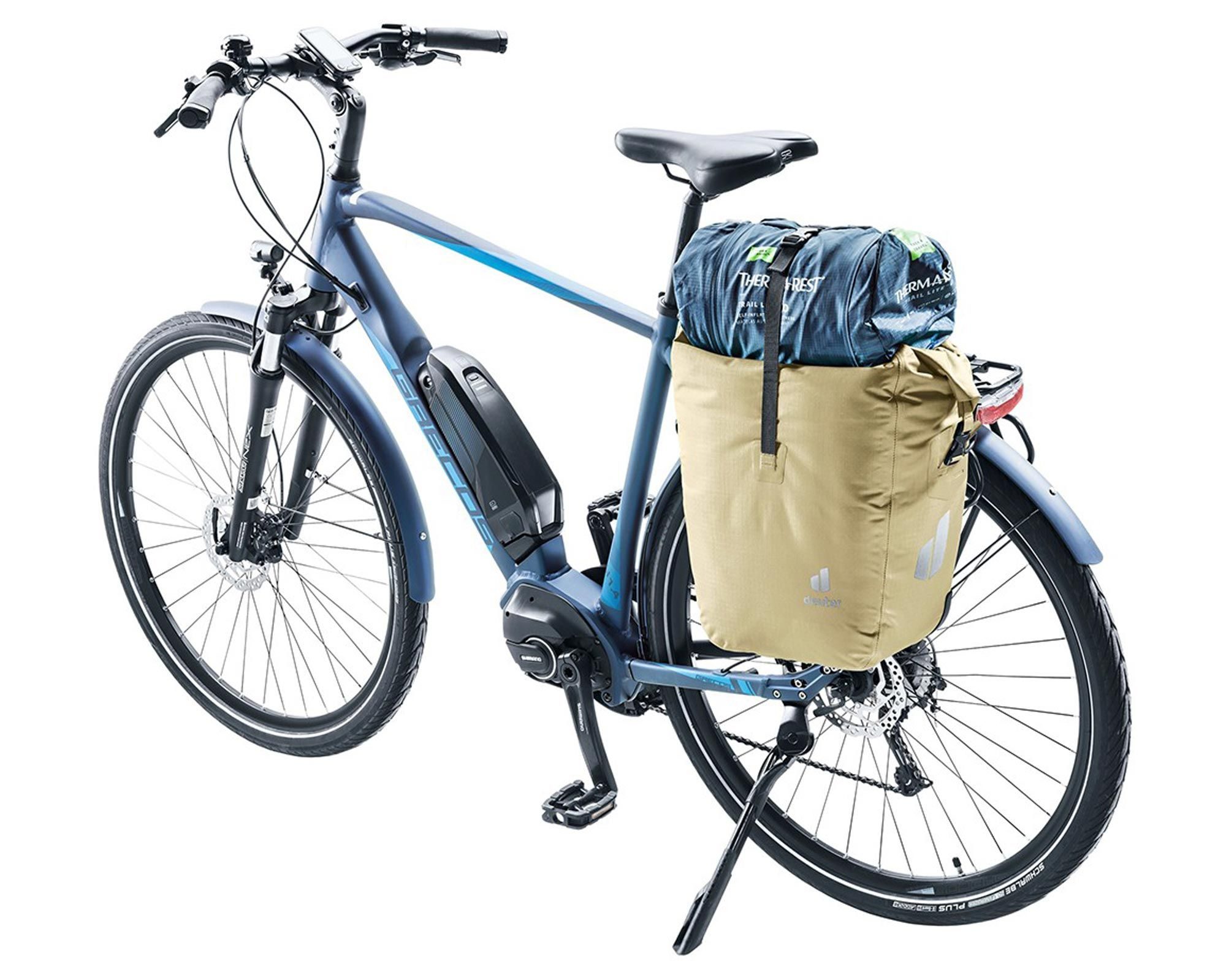 Deuter Weybridge 25+5 desert — практична водонепроникна сумка для велосипеда, розроблена для максимального комфорту під час подорожей та щоденних поїздок. Виготовлена з міцного матеріалу 420D PA Ripstop TPU, вона надійно захищає ваш багаж від дощу та бризок води.