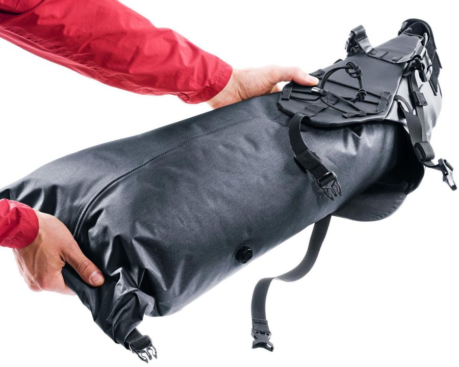Двоскладова конструкція: знімна суха сумка вставляється в ремінь‑гарнітуру, яку легко встановити без інструментів. Фастекси і Velcro-стрічки забезпечують комфорт та міцність.