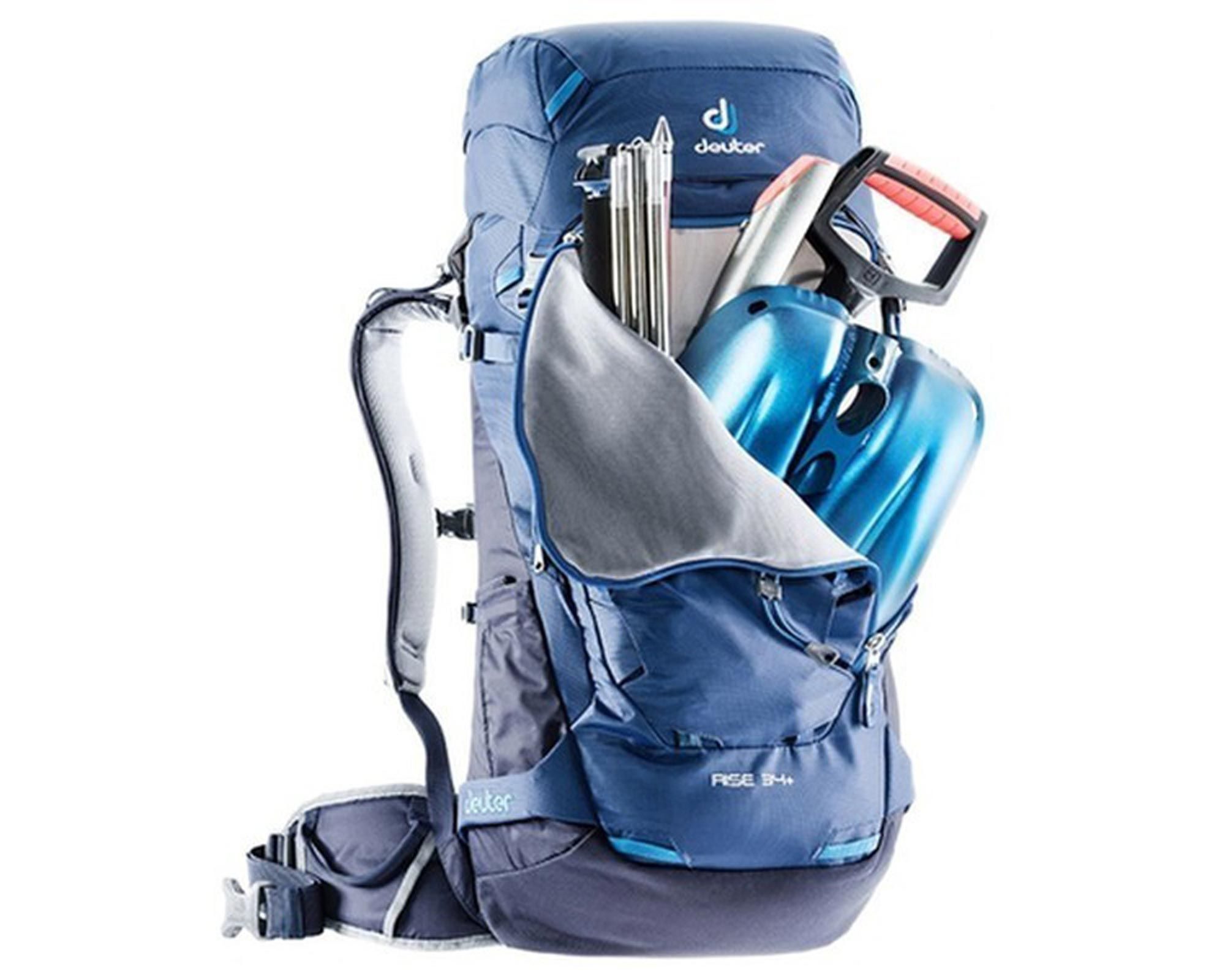 Deuter Rise 34+ steel‑navy — технічний скі‑туровий рюкзак обʼємом 34 л з можливістю розширення до 42 л за рахунок регульованої кришки. Передбачений для зимових виходів у гори, із фронтальним доступом до спорядження й задньою блискавкою для швидкого вмісту.