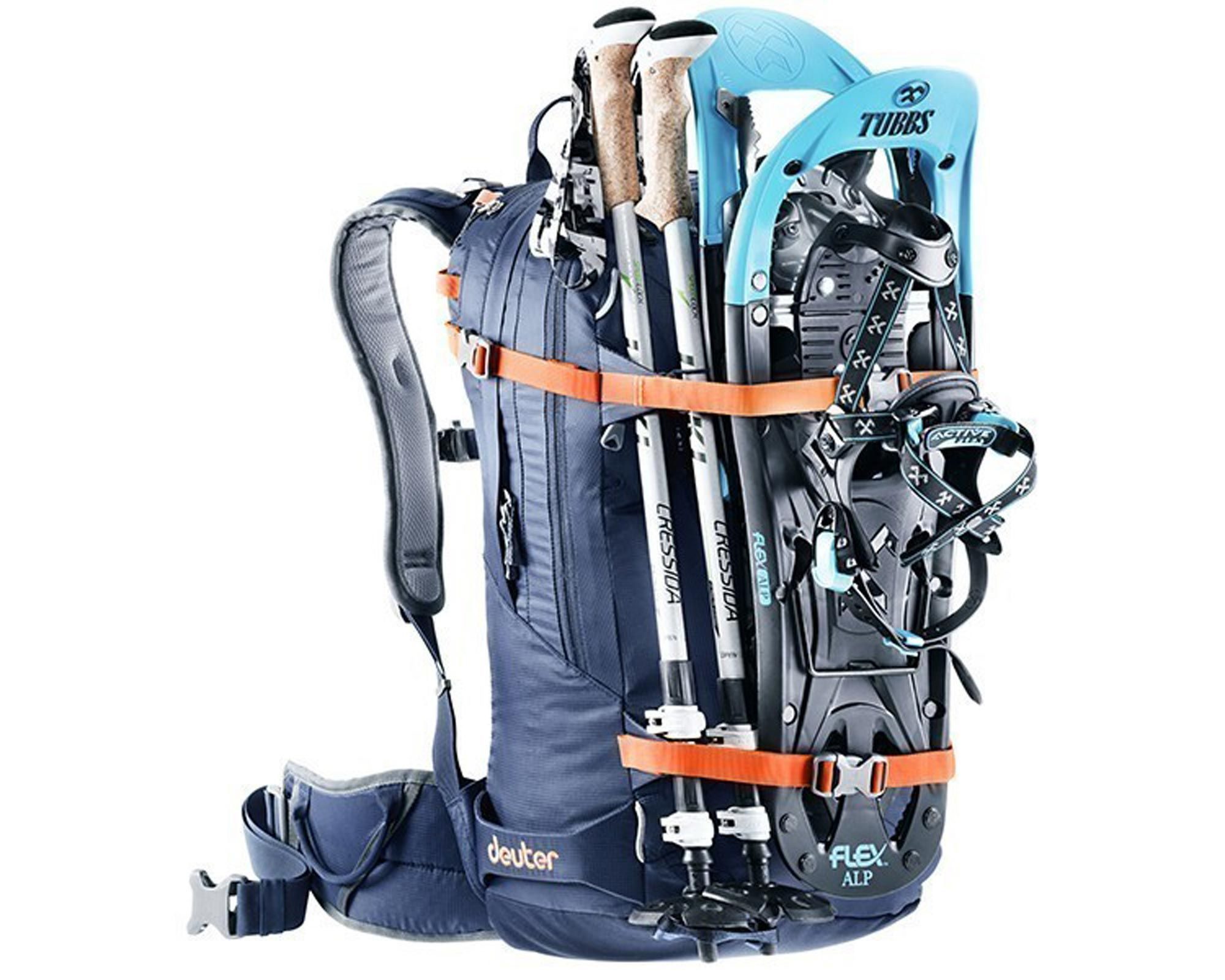 У комплекті: кріплення для лиж (A‑Frame або центрально), стрепи для сноуборду або снігоступів, петлі для льодоруба/палиць, зовнішній відсік для лопати й щупа.