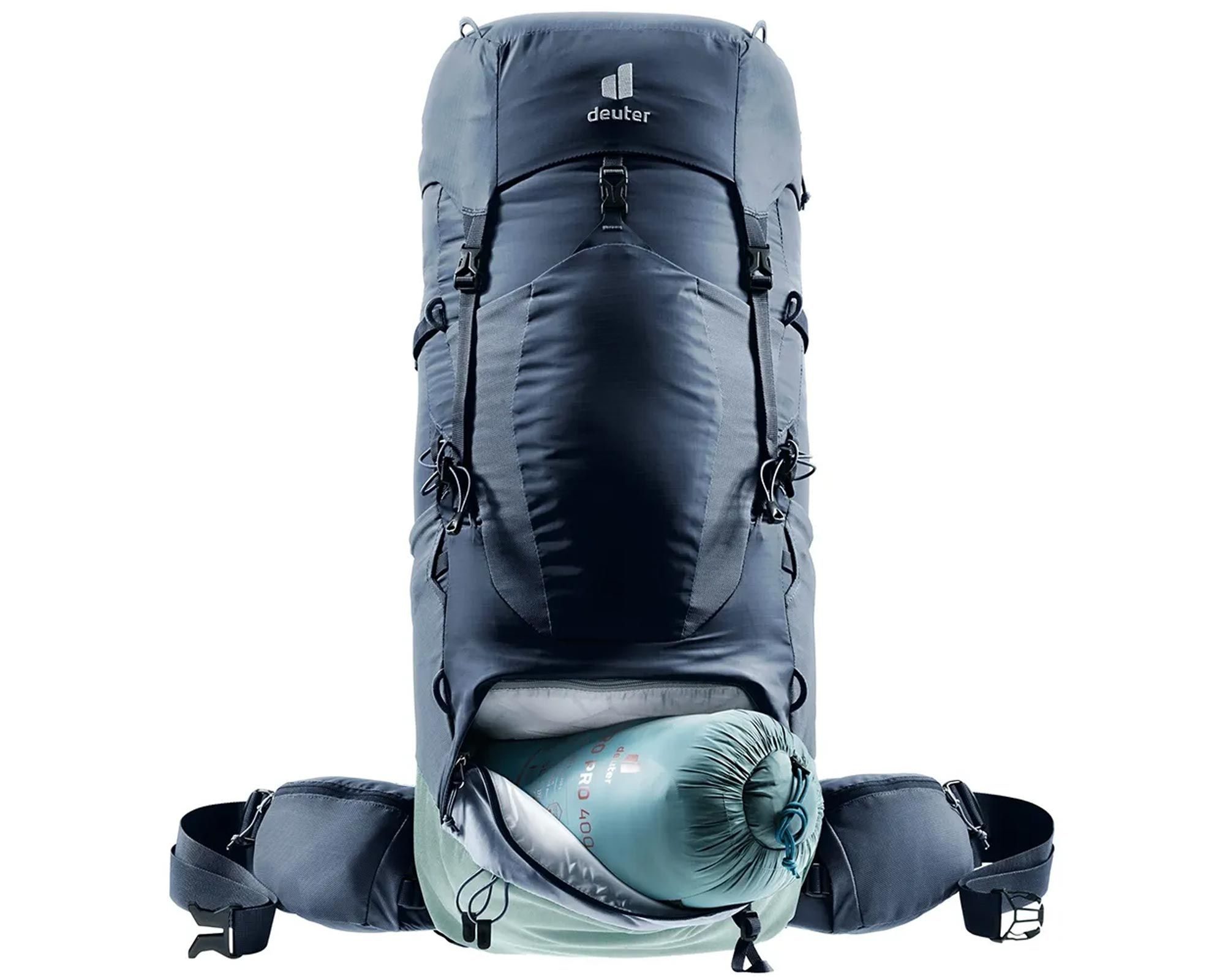 Front‑U доступ до основного відділення, zip-divіder нижнього спальника, stretch-кишені, кріплення для льодоруба/палиць, H₂O‑сумісність, SOS‑ярлик.