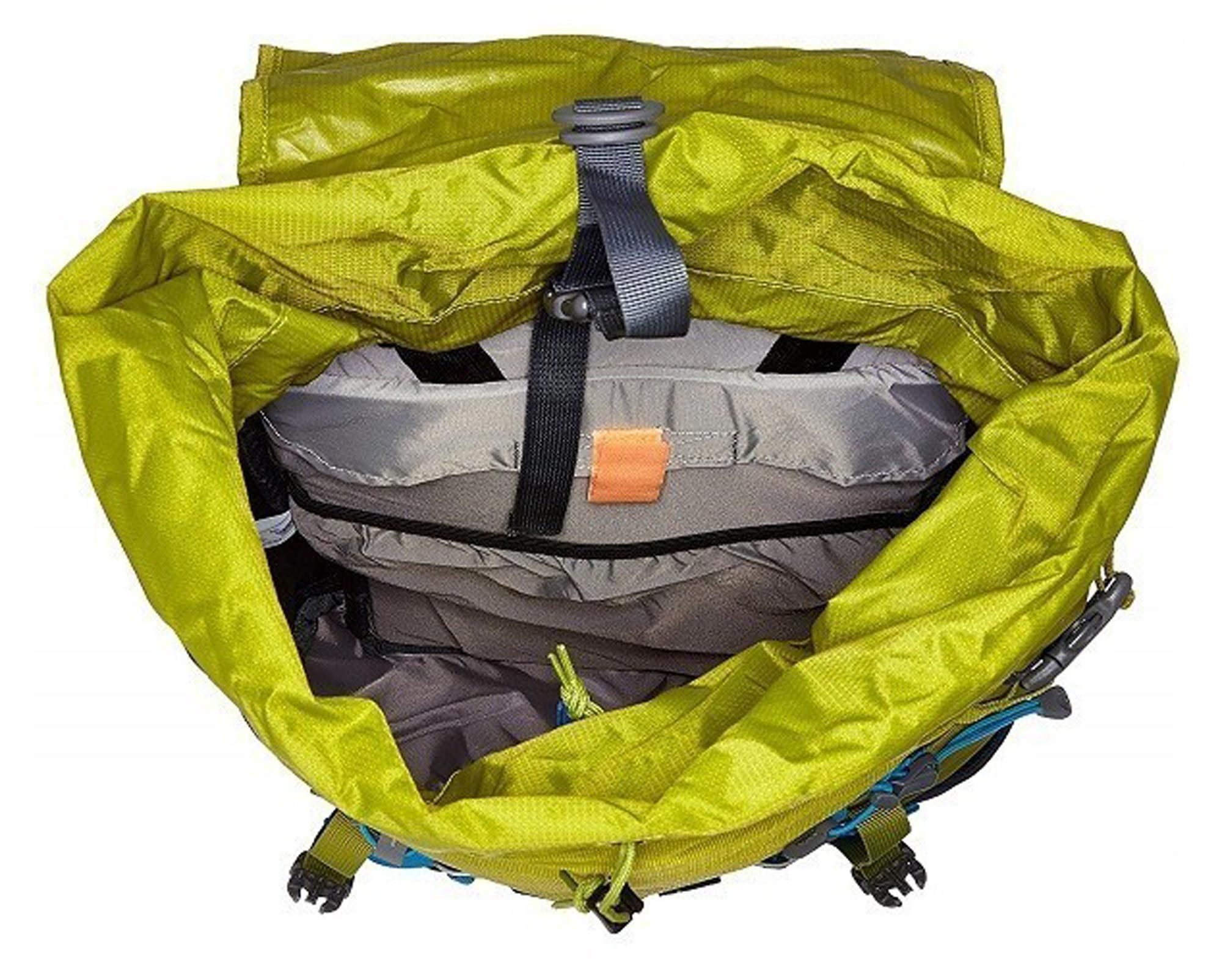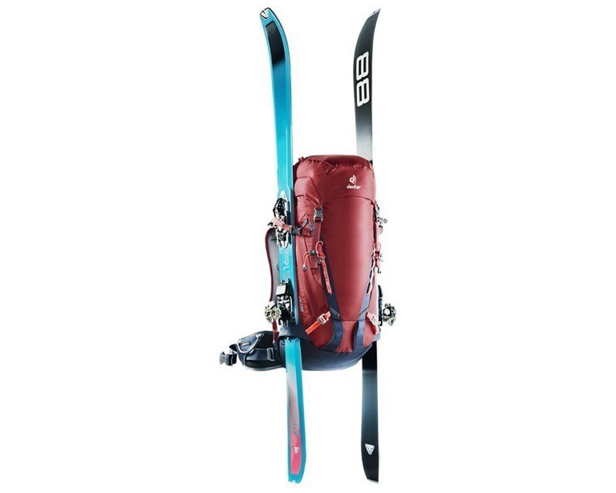 Передбачені посилені бокові фіксатори для лиж, петля для льодоруба, а також петлі для кріплення шоломоутримувача. Відділення для вологого одягу захищає решту спорядження, а зносостійкі матеріали 330D PA 6.6 Ripstop і 600D PES витримують контакт зі скельним рельєфом.