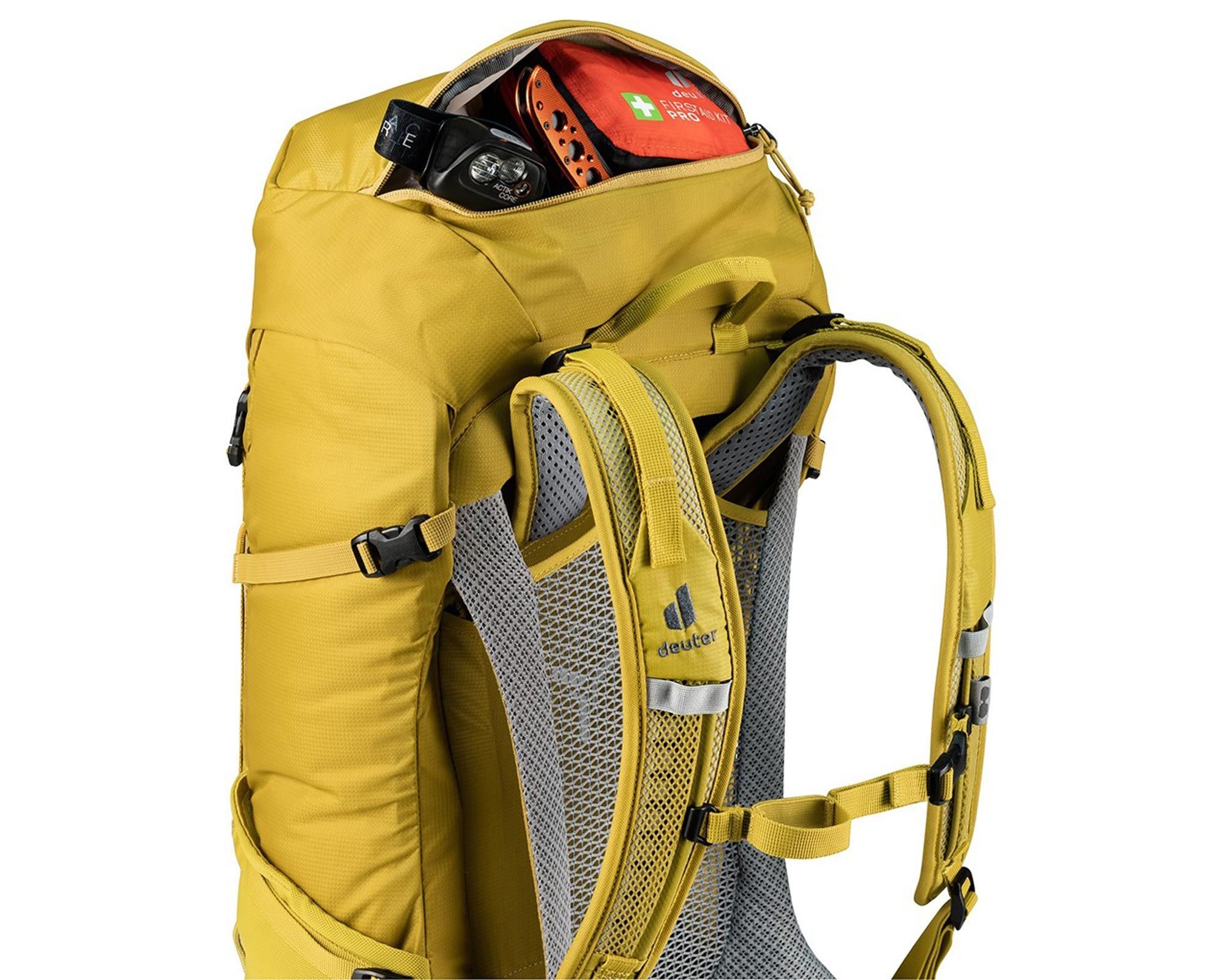 Deuter Futura 32 у кольорі turmeric-greencurry — це сучасний трекінговий рюкзак, розроблений для нетривалих та багатоденних походів, де важливі комфорт і зручність використання. Завдяки системі вентиляції Aircomfort забезпечується до 25% менше потовиділення, що підвищує ефективність руху та знижує втому.