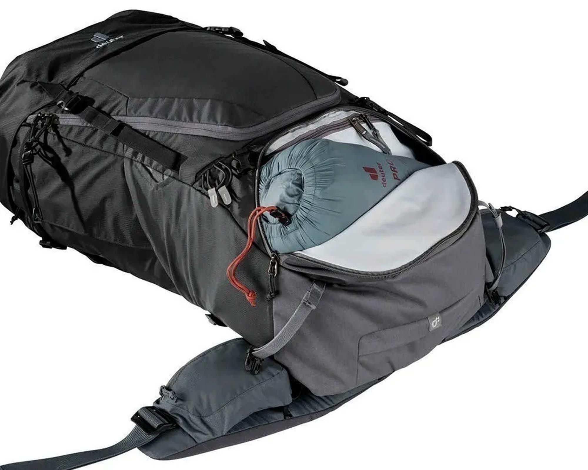 Велика U‑доступ із передньої панелі, нижній відсік, тентований Rain Cover, поясні кишені, петлі для льодоруба/палиць, ключ-кліп і бокові кишені.