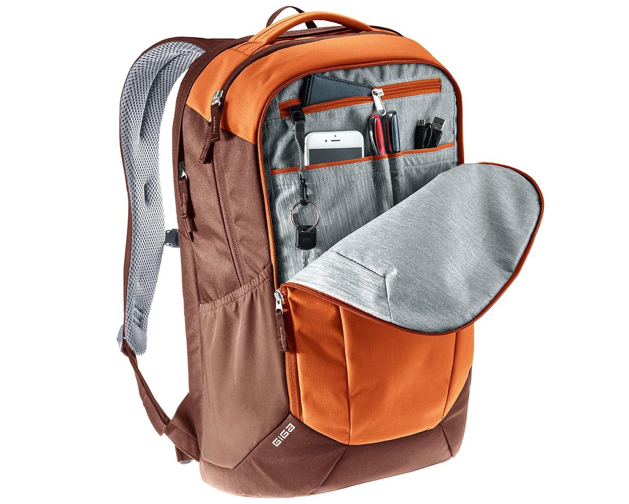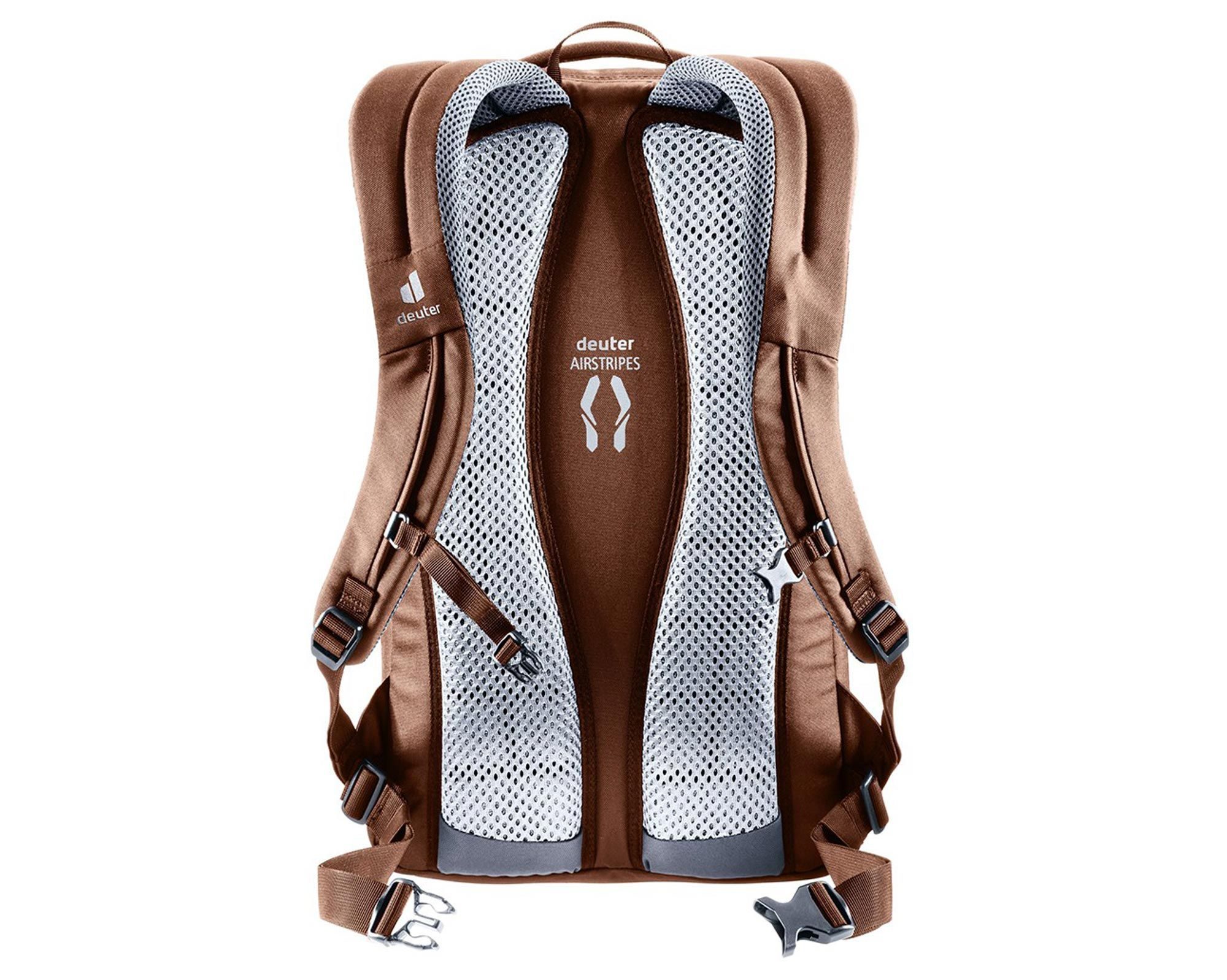 Deuter Giga chestnut-umbra — надійний міський рюкзак, створений для тих, хто цінує комфорт, функціональність і довговічність. Система спинки Airstripes з двома вертикальними вентиляційними вставками забезпечує стабільну посадку та постійну циркуляцію повітря, зменшуючи потовиділення навіть під час активного руху. Ергономічні плечові лямки, регульований нагрудний ремінь і знімний поясний ремінь рівномірно розподіляють навантаження, зберігаючи комфорт при перенесенні важких речей.