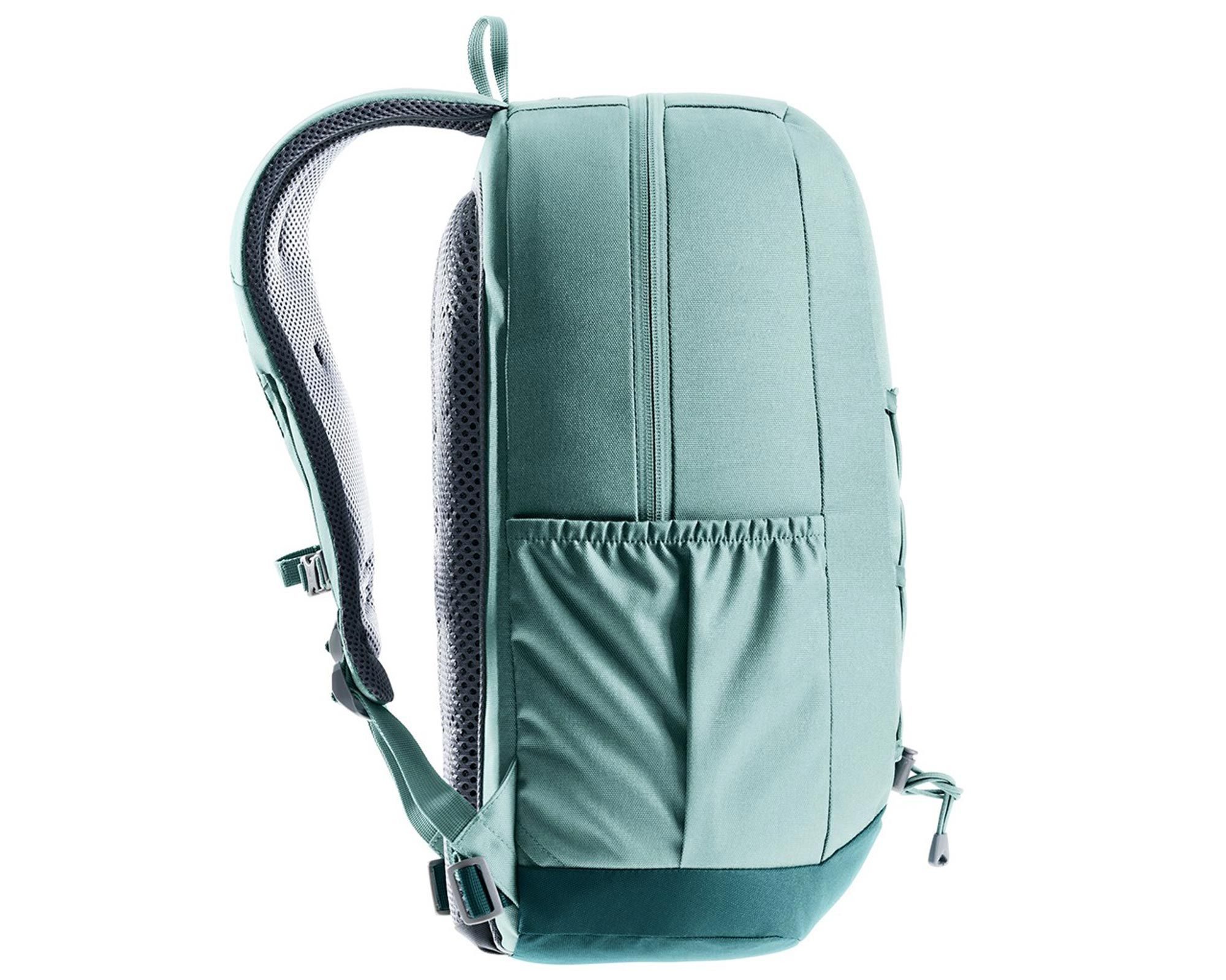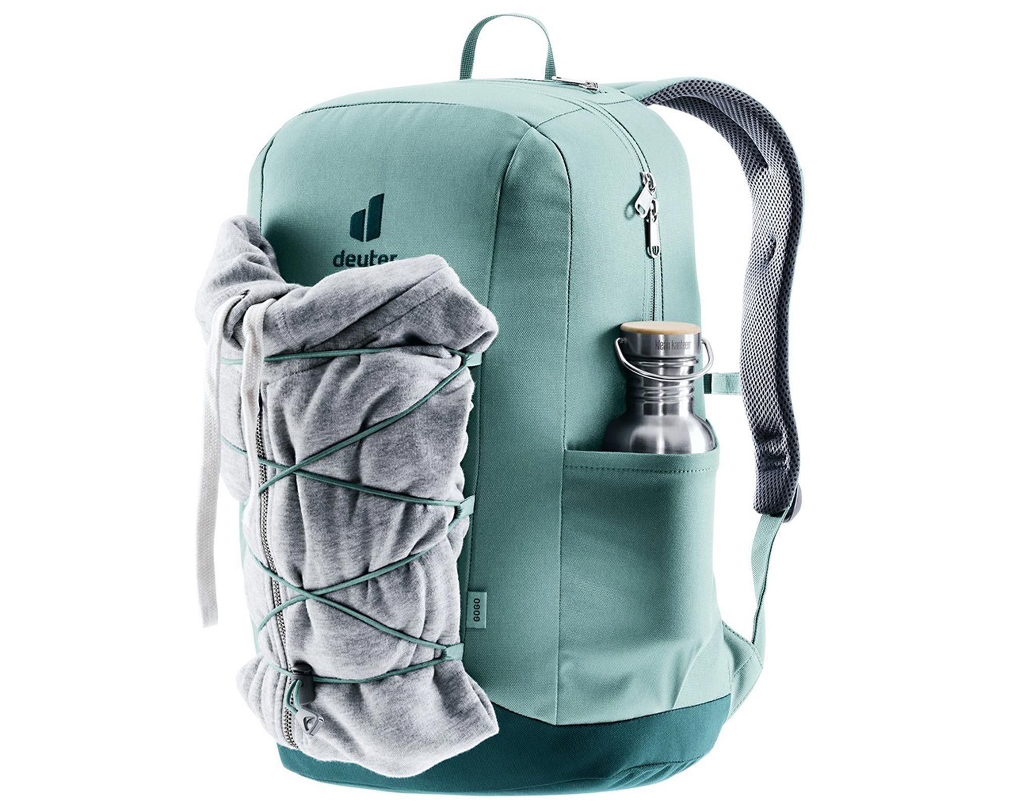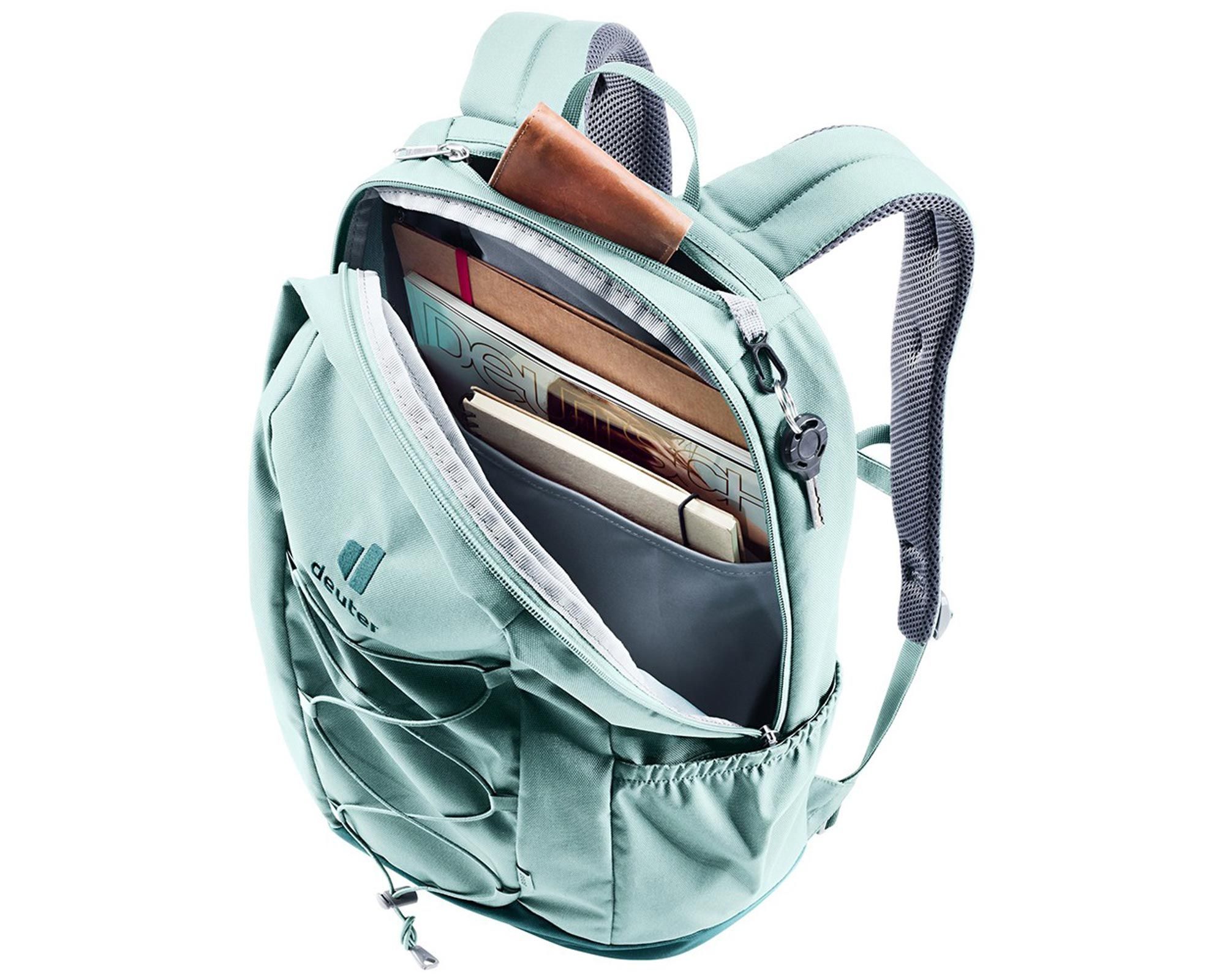 Deuter Gogo jade-deepsea — сучасний міський рюкзак з містким і добре організованим внутрішнім простором. Великий отвір на блискавці забезпечує швидкий доступ до основного відділення, де є кишеня для цінних речей та відділення для документів. На фронтальній частині розташований банджі-шнур для кріплення додаткових речей, а з обох боків — еластичні кишені для пляшки з водою чи аксесуарів.
