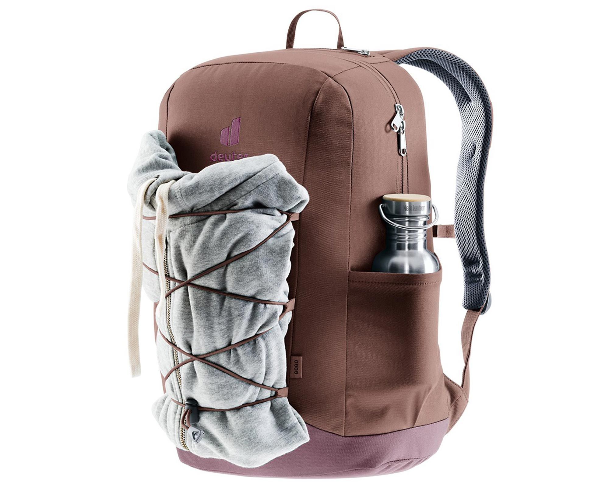 Deuter Gogo raisin-grape — функціональний та стильний міський рюкзак об’ємом 25 літрів, створений для щоденного використання. Завдяки ергономічній системі спинки Airstripes з вентиляційними каналами він забезпечує оптимальну циркуляцію повітря, знижуючи нагрівання та вологість спини. М’які плечові лямки анатомічної форми та регульований нагрудний ремінь гарантують комфорт навіть під час тривалого носіння.