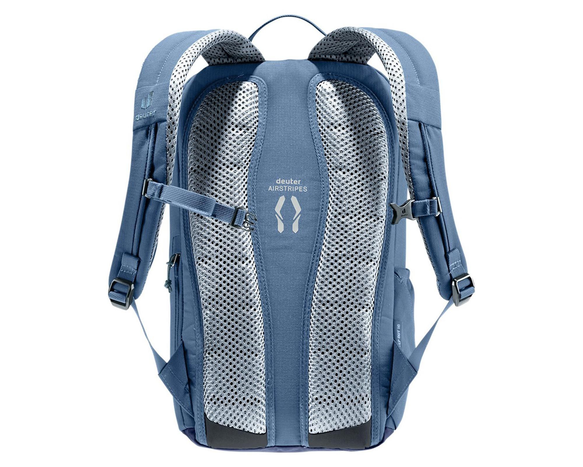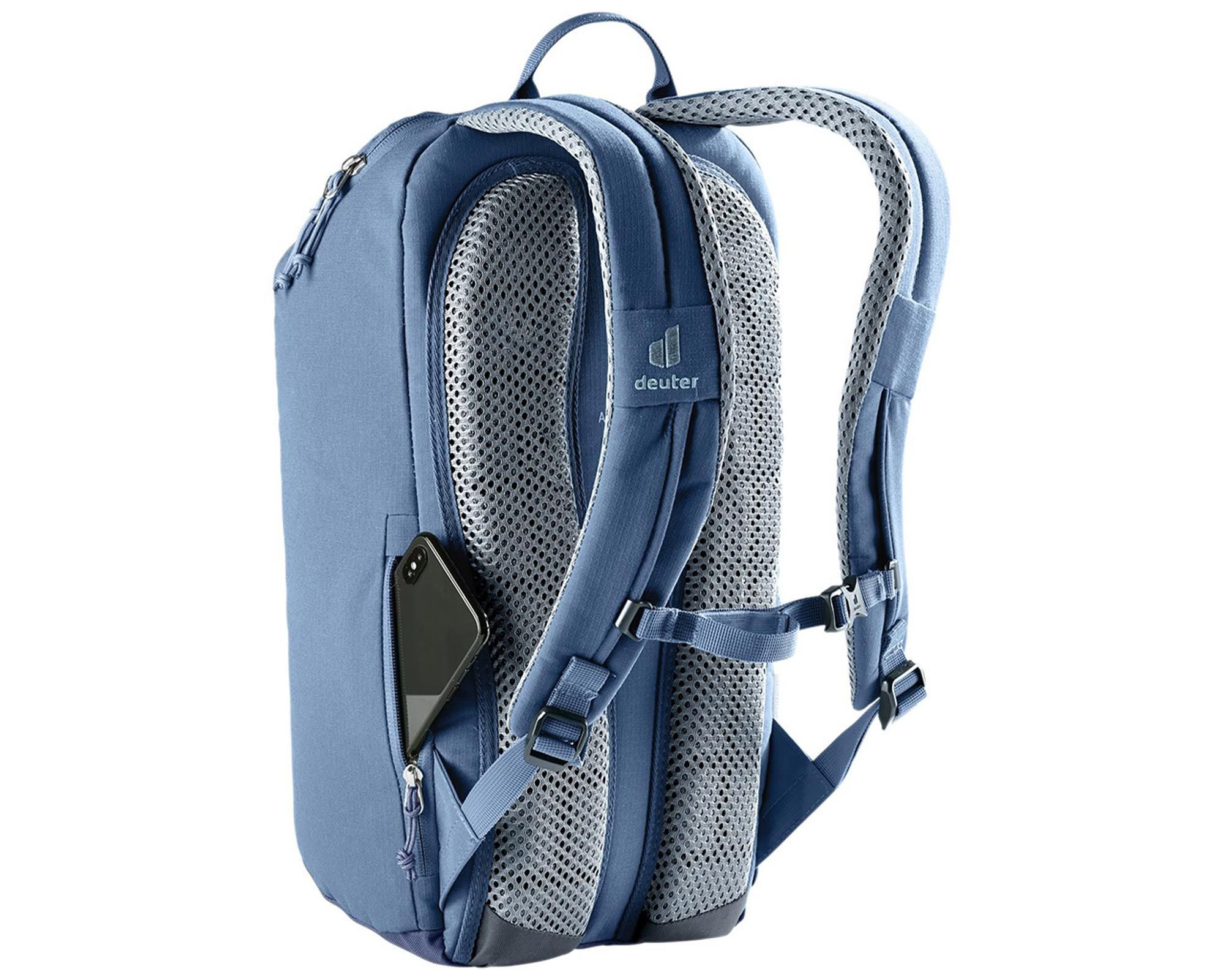 Deuter StepOut 16 у кольорі marine-ink — компактний і водночас місткий рюкзак для міського використання. Система спинки Airstripes з перфорованими лямками анатомічної форми зменшує площу контакту зі спиною, забезпечуючи ефективну вентиляцію та комфорт навіть у спеку. Велика U-подібна блискавка зверху дозволяє швидко отримати доступ до вмісту, а кишеня для мобільного телефону збоку, еластичні бічні кишені та органайзер всередині допомагають тримати все необхідне під рукою.