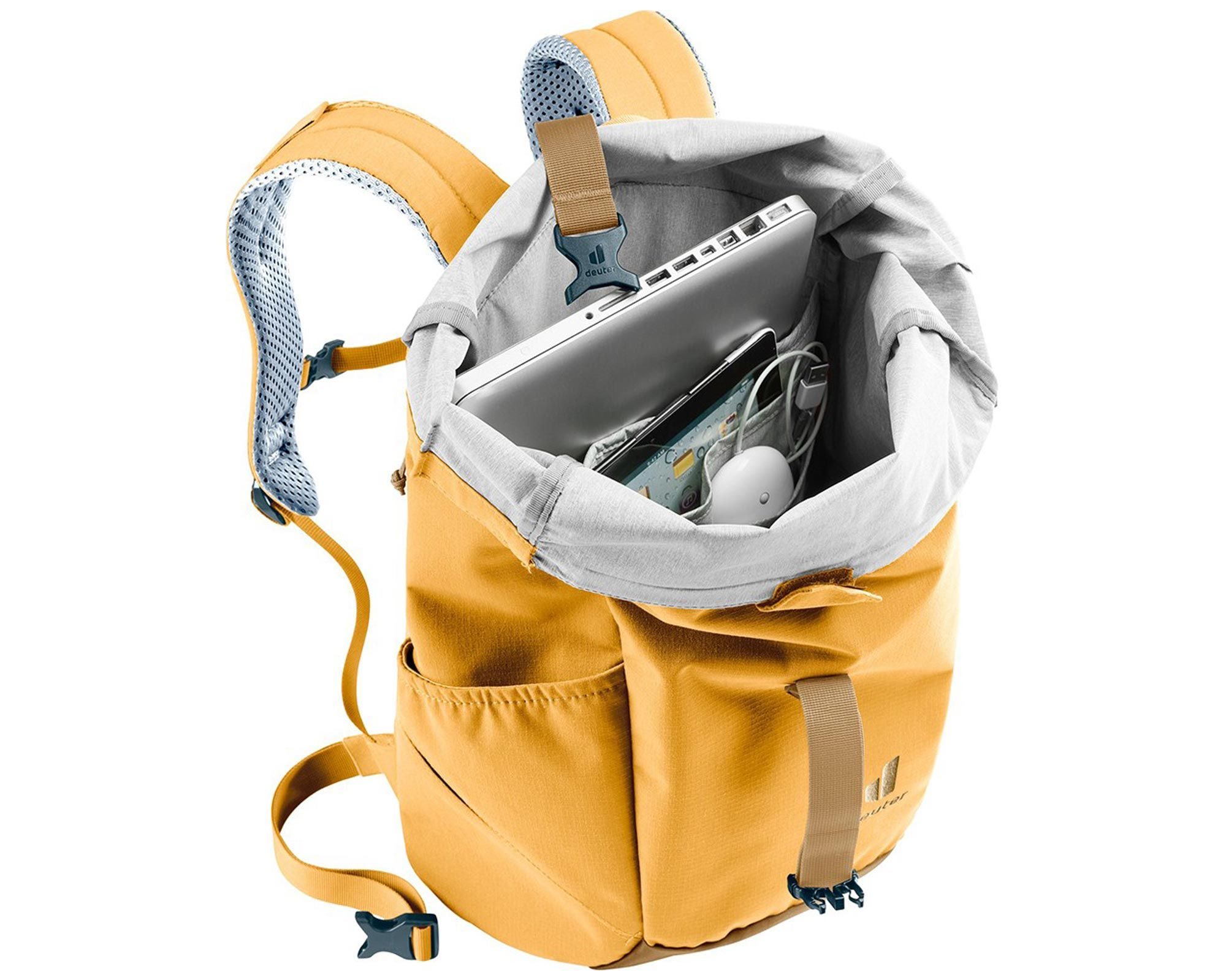 Рюкзак має верх із закруткою, що дозволяє збільшити об’єм, еластичні бічні кишені для пляшки, зручну кишеню для смартфона на спинці, а також відділення для документів і ноутбука до 15". Всередині – органайзер для аксесуарів та тримач для пляшки.