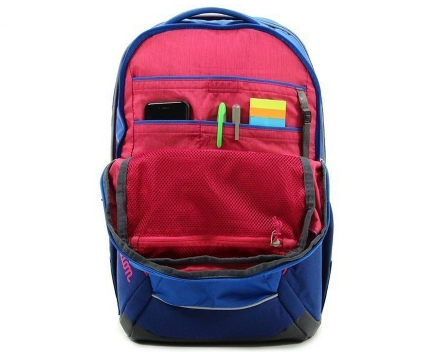 Велике основне відділення вміщує книги формату А4, в додаткові кишені — планшет, ланч-бокс, аксесуари; є фронтальний органайзер і бокові еластичні кишені для пляшки або термоса.