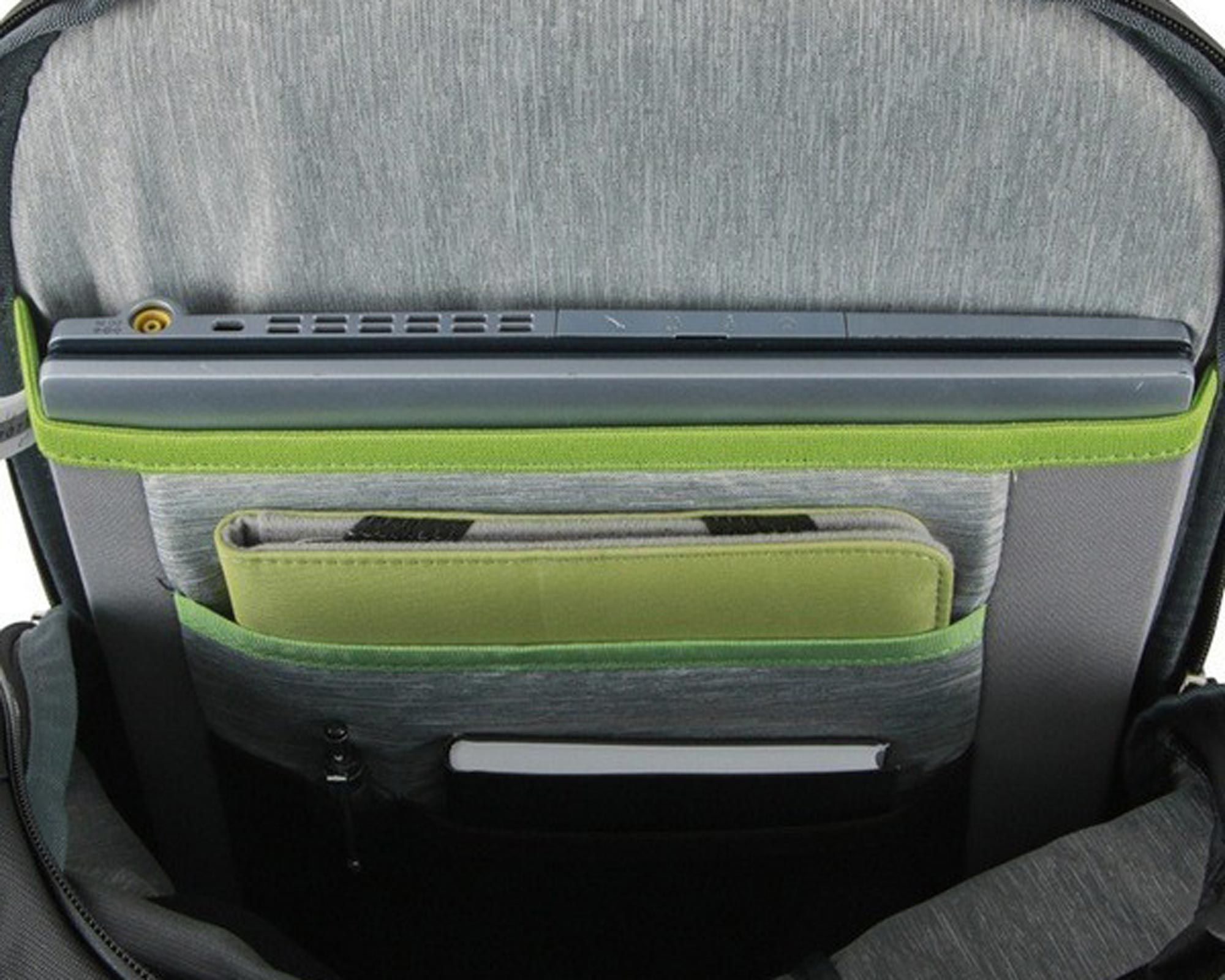 Виготовлений із міцних високотехнологічних матеріалів з водо- та брудовідштовхувальним просоченням, рюкзак має кришку, що згортається, з можливістю регулювання об’єму. Основне відділення оснащене окремим відсіком з флісовою підкладкою для ноутбука до 15,6" і планшета, з подвійним доступом: через верхній вхід або водонепроникну блискавку. Додатково передбачена фронтальна кишеня з органайзером, з’ємний поясний ремінь, карабін для ключів і светоотражаючі елементи для безпеки у темний час доби.
