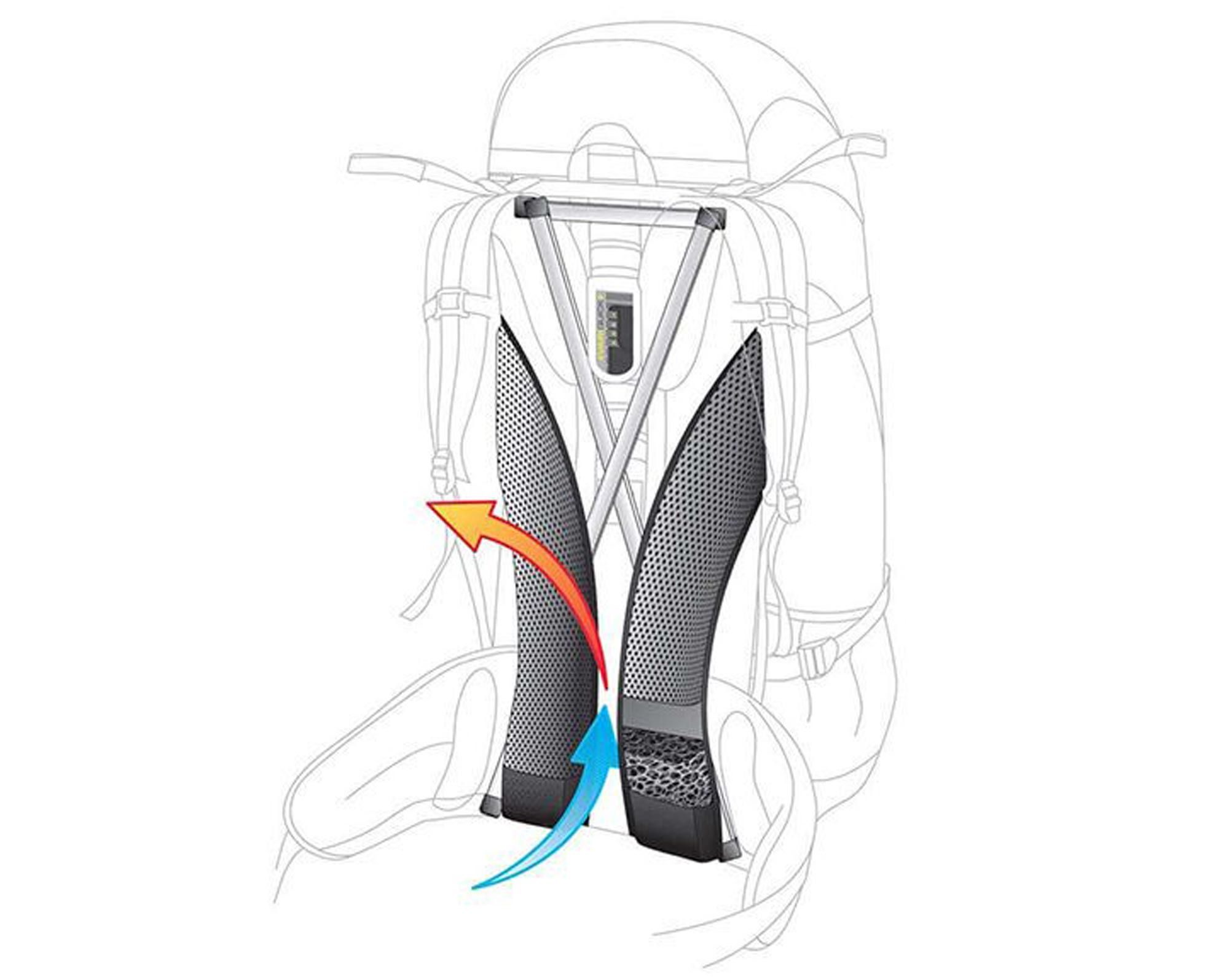 Спинна система з open‑cell foam та вентиляційним каналом забезпечує охолодження та комфорт при активному трекінговому використанні.