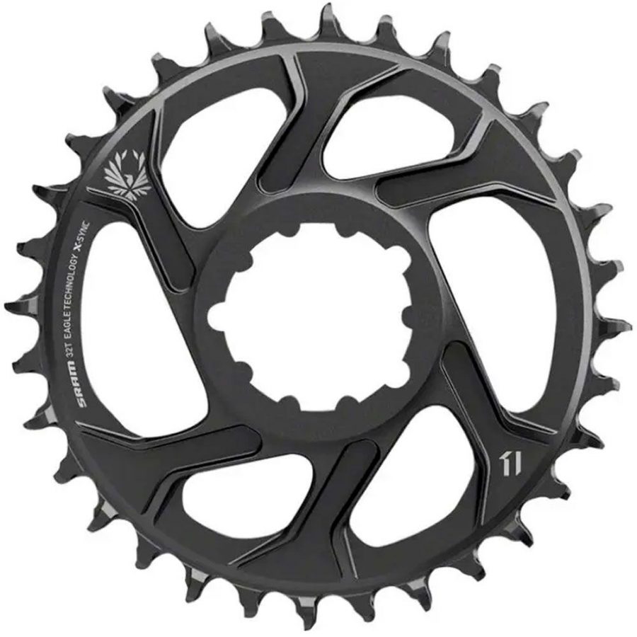 Зірка SRAM X-Sync 2 32T Direct Mount 6mm Offset Alum Eagle Black - є частиною технології Eagle, яка забезпечує найбільш плавні, тихі, довговічні і ефективні трансмісії, створені SRAM. Зовнішній вигляд зірки SRAM X-SYNC 2 Eagle є прямим результатом вивчення інженерами SRAM характеристик продуктивності та зносу тисяч зірок X-SYNC. Інженери піддавали зірки різного розміру численним випробуванням в лабораторних і реальних умовах, щоб створити модель, яка покращує продуктивність трансмісії Eagle в будь-яких умовах. Довші зуби з позитивним переднім кутом були розроблені для ідеальної роботи з новою ланцюгом Eagle, покращуючи утримання ланцюга та загальну ефективність педалювання, одночасно зменшуючи тертя, шум і знос.